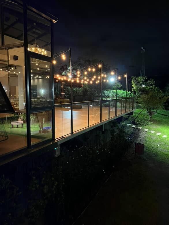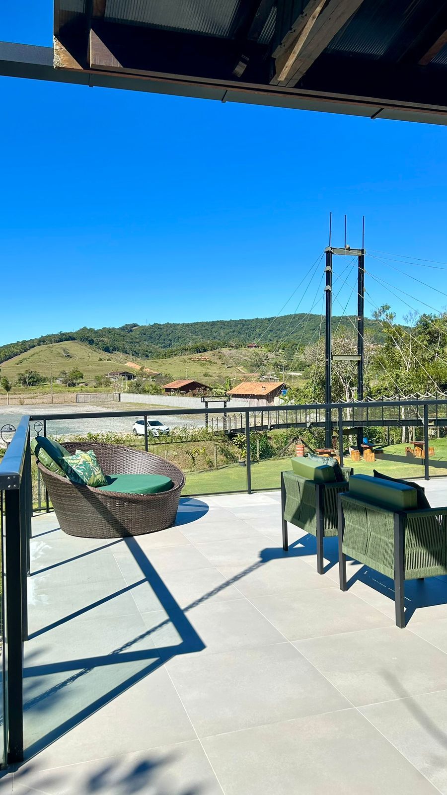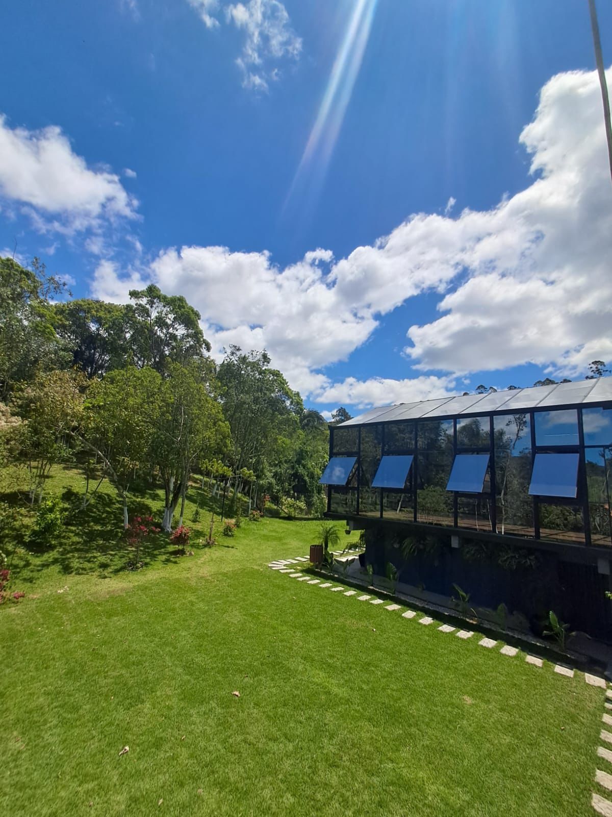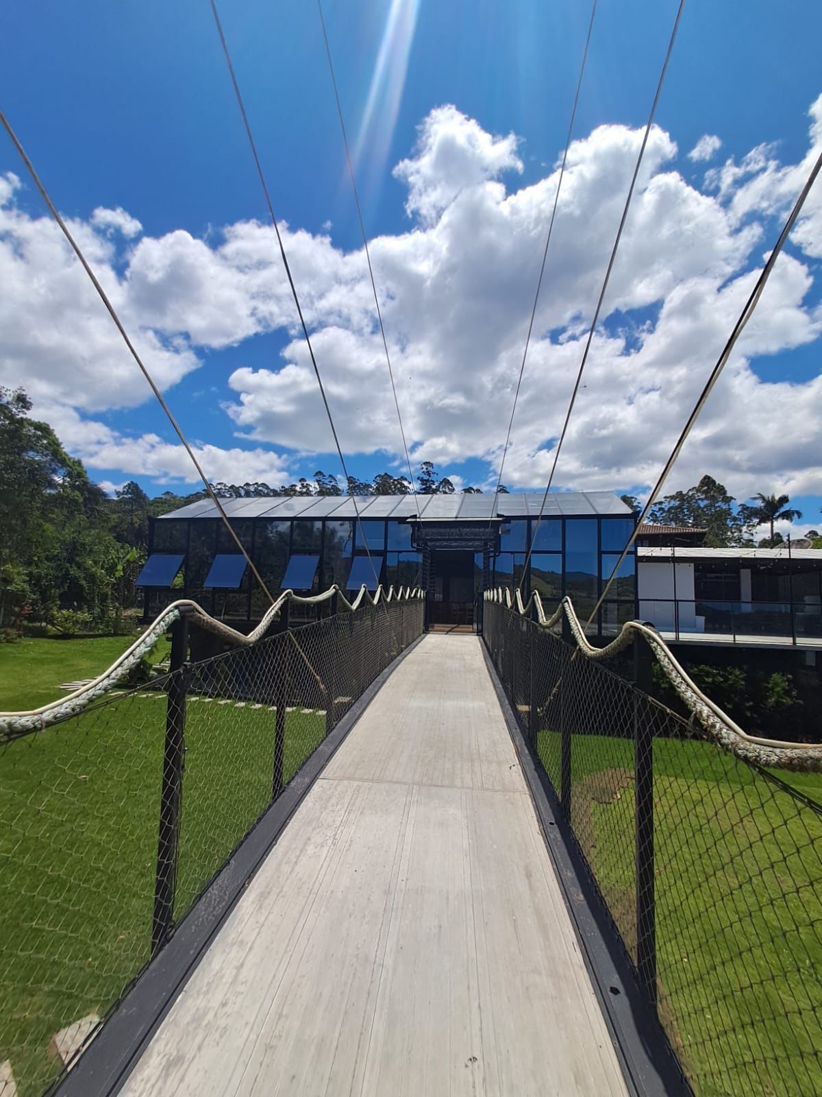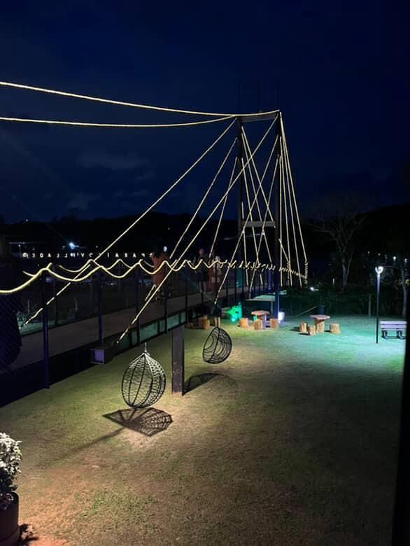 O espaço possui um amplo gramado, ao sair do estacionamento, tem-se acesso a ele pela ponte maior passando pelo salão coberto, ou pela ponte menor, acesso direto.